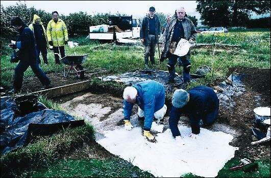 A fantastic Roman mosaic has been uncovered in a village near Banbury, Oxfordshire. The size of the site is indicative of a very important merchant's house and is considered by experts to be one of the top ten sites in the country. In this picture, workers from English Heritage start to paste a preservative over the mosaic before it is entombed in concrete. |